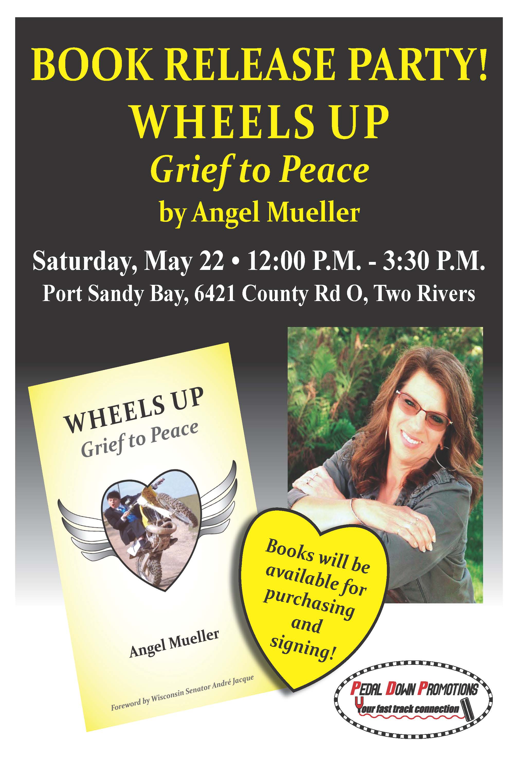 Mueller will hold a book launch party for “Wheels Up – Grief to Peace” on Saturday, May 22 at Port Sandy Bay, located at 6421 County Road O in Two Rivers from noon to 3:30 p.m. Mueller will be signing copies of the book, which will be available for purchase during the drop-in event.
